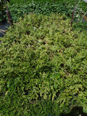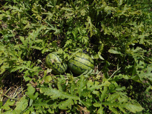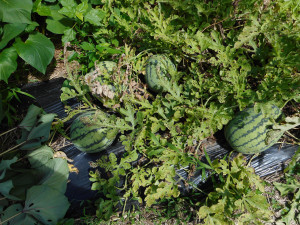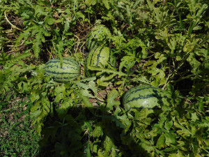 8月になり猛暑の影響もあったのか、ツルの勢いも陰りだし、徐々に地面が見えるようになってきた。と、同時に驚きの現実を目にした。いたるところにスイカがある。数えてみると12個。大きさや音で確認する限り、ほとんど同時くらいに受粉していると思われる。したがって、収穫時期もほとんど同時期になる。スイカは保存がきかない。一度ジャムを作ったが、全く美味しくなかった。スイカは生食しかない。これは大変である。近所の人にあげるとしても、味を確認してからでないとできない。半分に切って味を確認して、おいしければいいがそうでなければ自宅で消費することになる。これだけ多くの実が付けば、味の期待はできない。朝・昼・晩、食後のデザートはスイカ、10時と3時のおやつはスイカである。これと並行して寝酒のつまみはミニトマトである。7、8月は果物太りが恐ろしい。